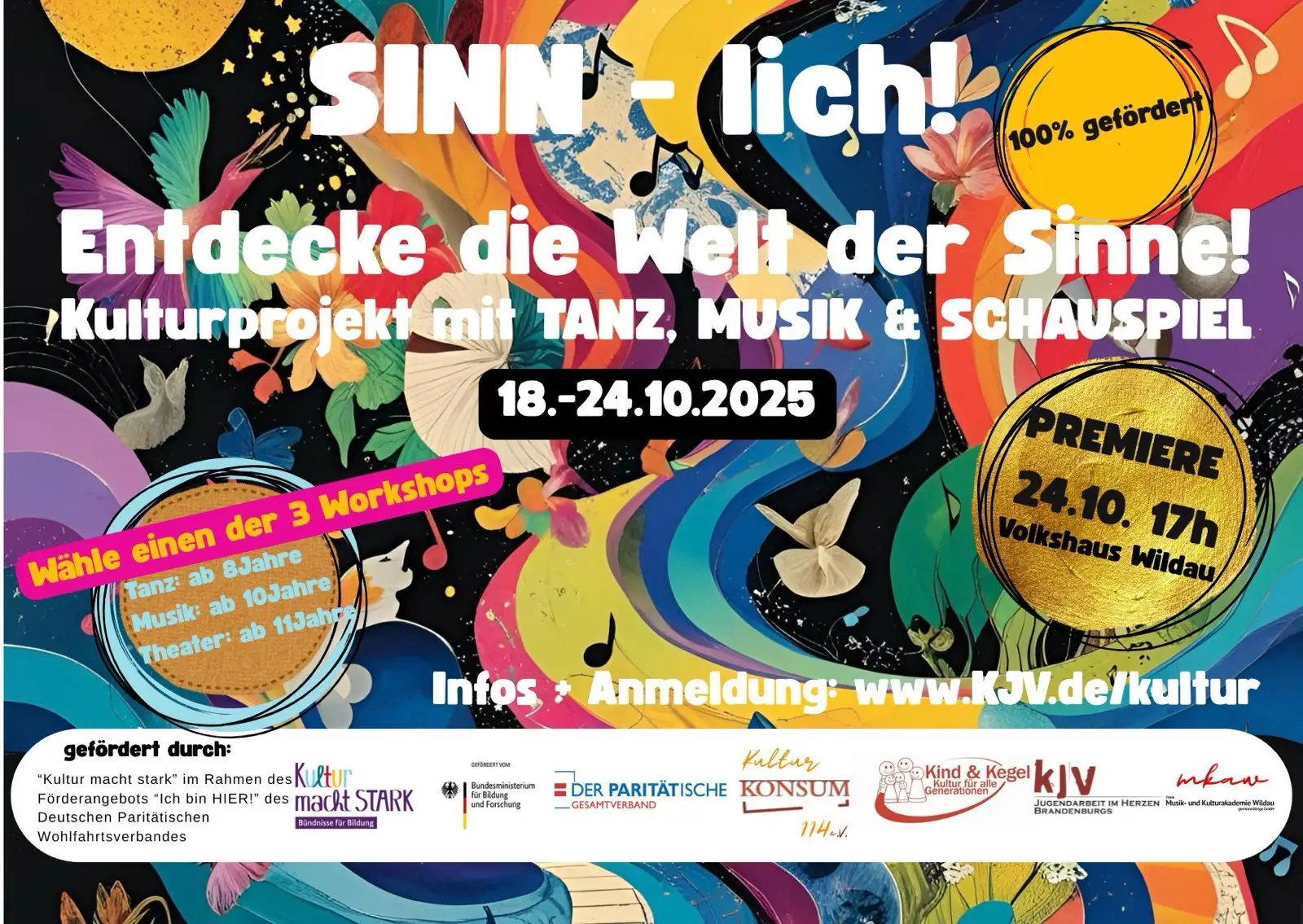 Schüler/innen erarbeiten in den Workshops Musik, Tanz und Schauspiel ein eigenes Bühnenprogramm mit Abschlussaufführung im Volkshaus Wildau.